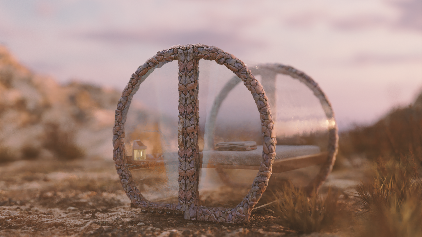 PathPod is a conceptual product visualization featuring a dynamic house designed for travelers along their journey. The structure opens and closes, integrating with its surroundings while remaining secure when closed. The house's design adapts to various environments - jungle, icy terrain, and rocky landscape - using local materials. Each environment is tailored to provide a comfortable and adaptable experience for travelers.